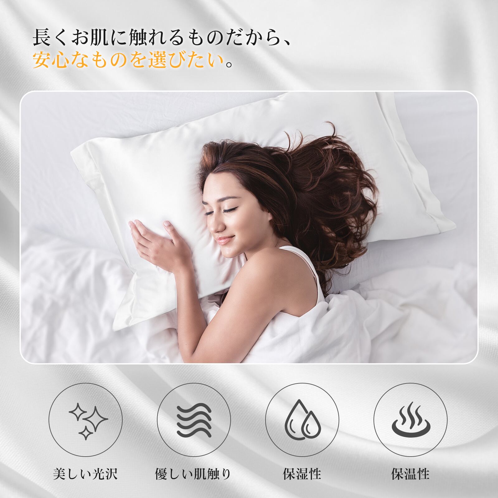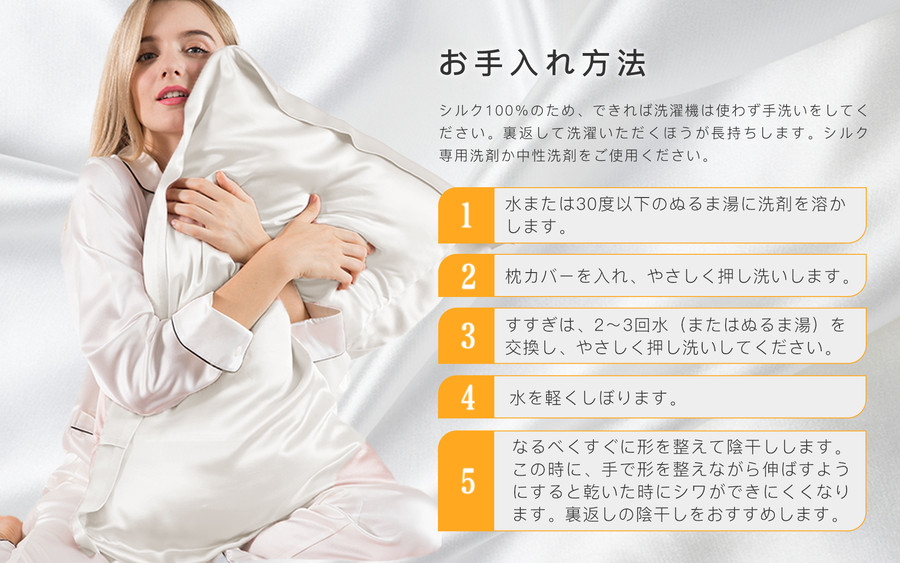 悩み続けた肩こり・首こり・不眠を枕で対策!シルクにお任せください。やわらかく、とろけるようなシルクならではの寝心地をお楽しみください。 シルクは美白・美髪の作用があり、シルク100%の枕カバーは頭皮や髪の刺激が防げて翌日の朝に髪の毛がサラサラになれる効果があります。肌にも優しくてシワを防んで美肌に良いです。人の肌に近いため、敏感な肌の方も安心して使えます。