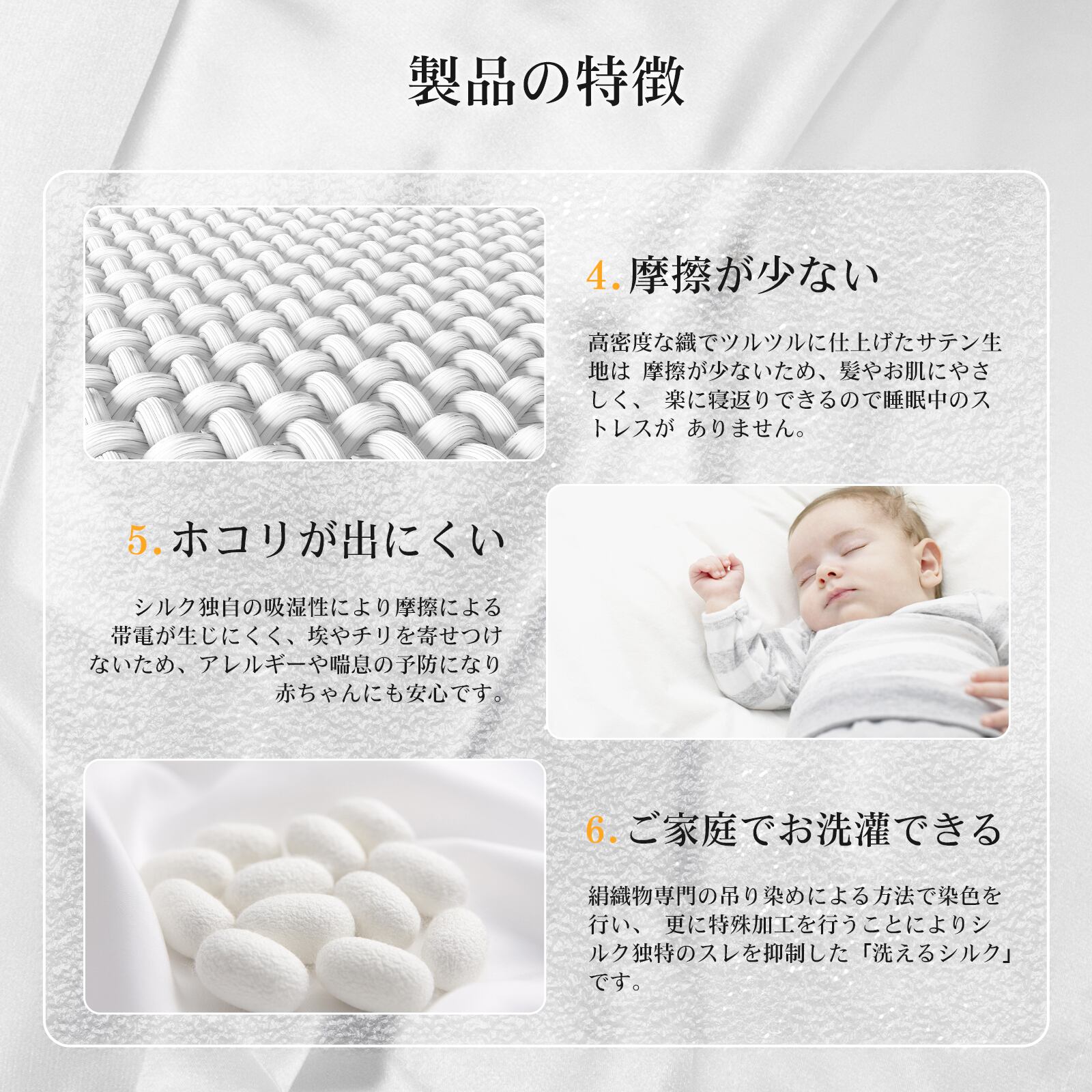 しかし、枕カバーがシルク製の場合、繊維がとても滑らかで柔らかいので摩擦を大きく軽減できます。さらに、シルクはヒトの肌・髪とほぼ同じ18種類のアミノ酸(タンパク質)で構成されていることも、肌と髪に優しい理由です。