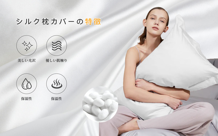 悩み続けた肩こり・首こり・不眠を枕で対策!シルクにお任せください。やわらかく、とろけるようなシルクならではの寝心地をお楽しみください。 シルクは美白・美髪の作用があり、シルク100%の枕カバーは頭皮や髪の刺激が防げて翌日の朝に髪の毛がサラサラになれる効果があります。肌にも優しくてシワを防んで美肌に良いです。人の肌に近いため、敏感な肌の方も安心して使えます。