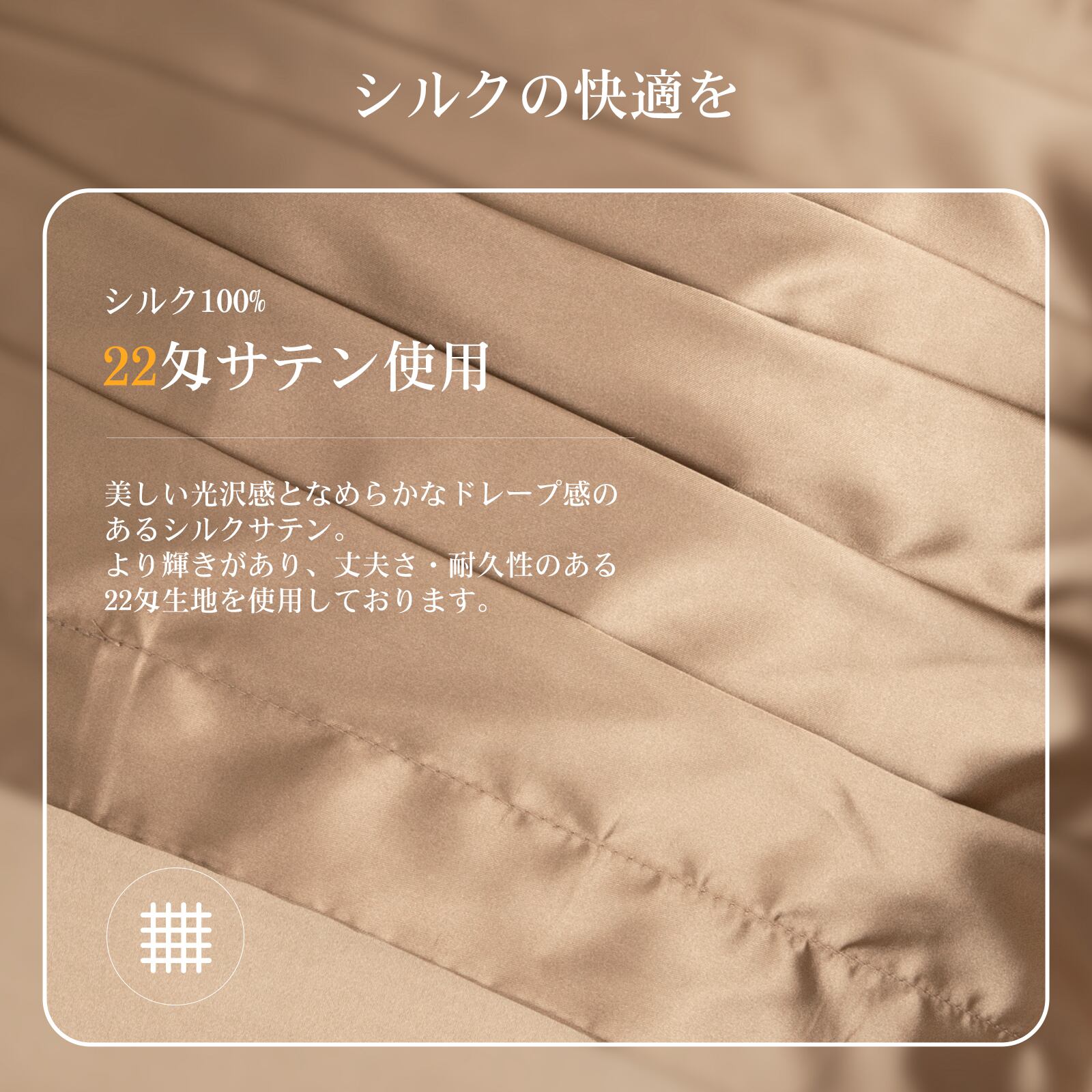 しかし、枕カバーがシルク製の場合、繊維がとても滑らかで柔らかいので摩擦を大きく軽減できます。さらに、シルクはヒトの肌・髪とほぼ同じ18種類のアミノ酸(タンパク質)で構成されていることも、肌と髪に優しい理由です。